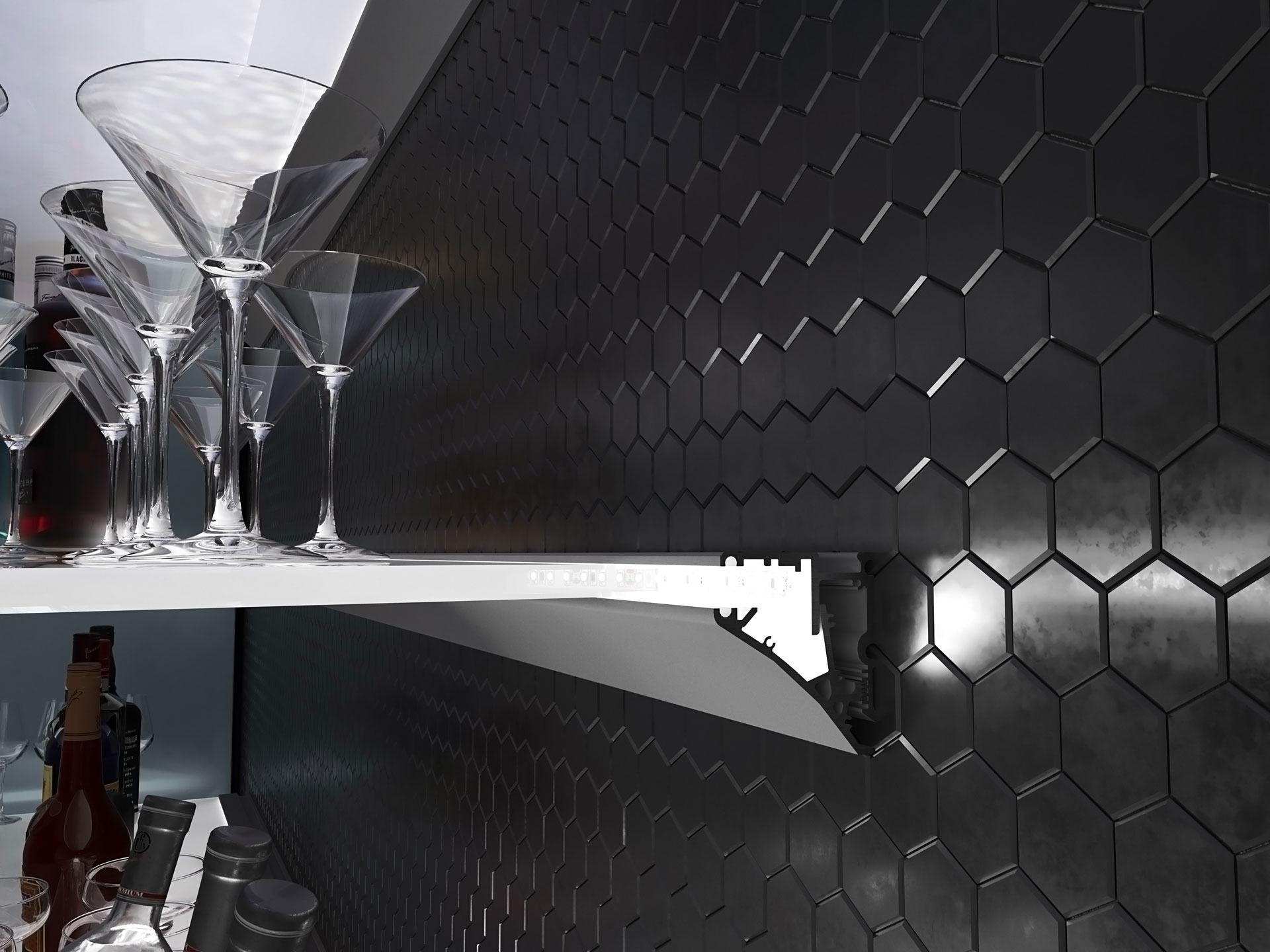 Profil umożliwia montaż dwóch taśm LED jednocześnie, co pozwala na doświetlenie krawędzi tafli szkła oraz podświetlenie tylnej części półki. Kompatybilny z wieloma typami osłonek, dedykowany do taśm LED SMD i COB. Montaż za pomocą wkrętów meblowych.