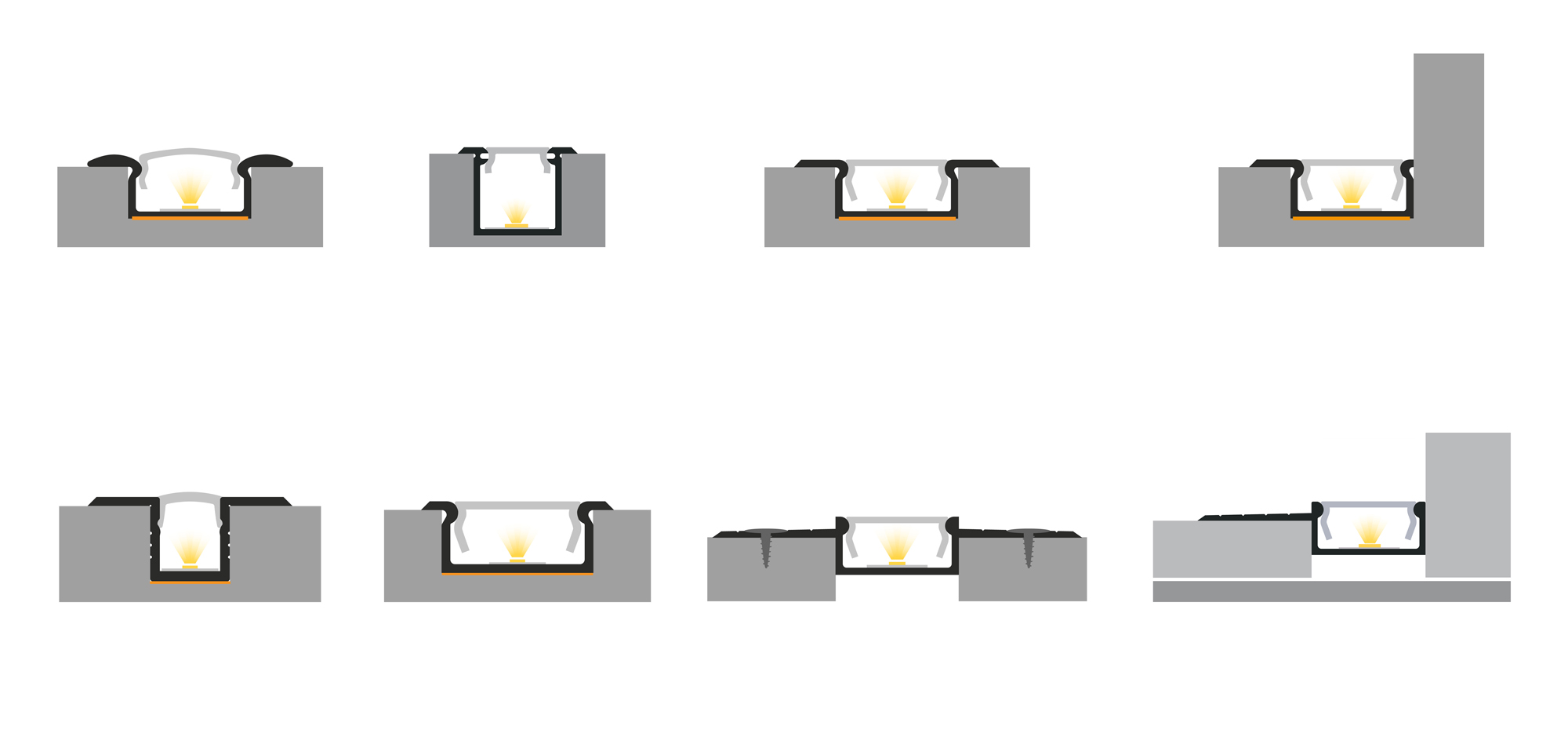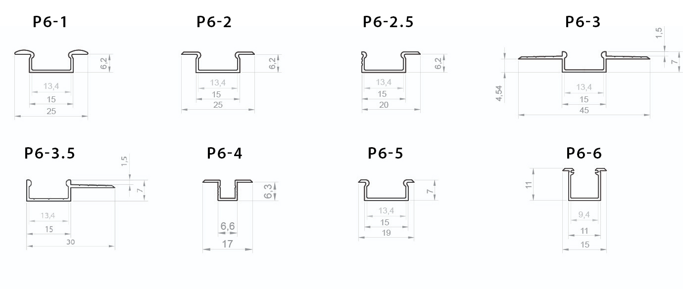 Profile z rodziny P6 wykonane są z wysokiej jakości aluminium, dostępne w wielu wariantach kolorystycznych – od klasycznego aluminium, przez biel, czerń i grafit, po eleganckie złoto. Seria obejmuje osiem modeli o zróżnicowanych wymiarach – od ultra kompaktowego P6-4 (17×6,3 mm) po P6-3 (45×7 mm). Wszystkie profile charakteryzują się niewielką głębokością montażową, umożliwiając instalację w wyfrezowanych szczelinach. Dostępne w długościach standardowych 1000-3000 mm oraz na zamówienie do 6000 mm, z klasą ochrony IP20.